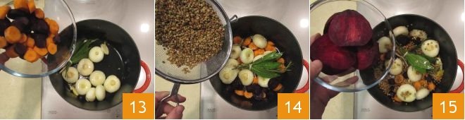 the carrot slices 13, the lentils 14, and the beets 15.