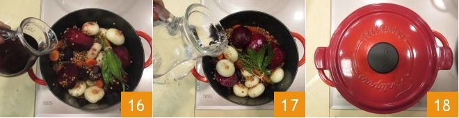 Toast everything for a few minutes, stirring often with a wooden spoon, then deglaze with the red wine 16 and let it evaporate. At this point, lower the heat and cover with enough water to submerge the ingredients (the amount of water will depend on the size of the pot; we used about 2 cups for a 20 cm diameter pot) 17. Cover with the lid 18 and cook on low heat for 2 hours, stirring occasionally and adding a bit more water if necessary: in this case, we added an additional 1 cup of water in a couple of times. During the last 20 minutes, you can adjust the salt and pepper. If at the end of cooking the stew is too brothy, let it reduce for a few more minutes without the lid; if, on the contrary, it is too dry, you can add another ladle of water.