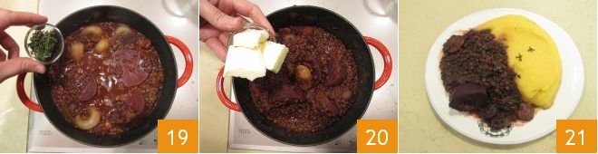 After 2 hours, remove the herb bundle and check the beets' doneness with a fork: the tines should easily penetrate, but the texture should remain firm and meaty. At this point, turn off the heat and add fresh thyme 19, then add the butter 20, cover with the lid and let it melt gently. Finally, mix well and serve your fragrant beetroot and lentil stew with polenta or mashed potatoes 21!