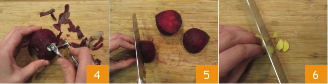 Peel the beets as well 4 and cut them in half 5, then peel a small root of fresh ginger and slice it thinly 6.