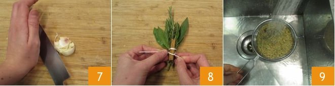 Crush the garlic clove with the back of a knife 7 and remove the skin. Tie the bay leaves, rosemary sprig, and cinnamon stick with kitchen twine 8. Finally, rinse the lentils under running water 9 and do the same with the onions.