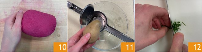 Once you have obtained a smooth, elastic, and homogeneous dough 10, wrap it in plastic wrap and place it in the refrigerator to rest for at least 30 minutes. In the meantime, the potatoes will be cooked, so mash them in a bowl 11. Cut the mint leaves into very thin strips 12.