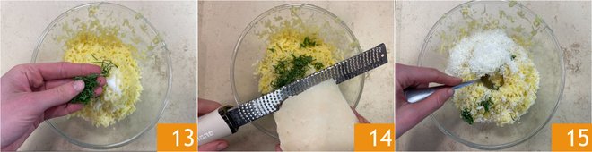 Add the mint to the mashed potatoes 13 along with a pinch of salt and the grated pecorino cheese 14. Mix well to combine the mixture 15 and set aside.