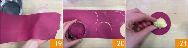 Once you have obtained a sheet with a thickness of approximately 1/16 inch 19, cut out discs with a 4-inch diameter cookie cutter 20. You can re-knead the scraps and roll them out again after a brief rest. Place a ball of filling in the center of each disc 21.