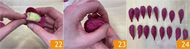Fold the disc in half and pinch the edges starting from one end 22 to the other, sealing the filling inside 23; it's normal for a little filling to poke out at the end. As you form the culurgiones, place them on the work surface lightly dusted with semolina 24 and set them aside for a moment.