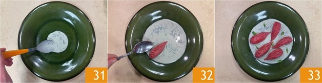 Spread the Roquefort sauce on the base of the plate 31, then place the culurgiones 32 and garnish with mint leaves. Your beetroot culurgiones with potatoes and blue cheese sauce 33 are ready!
