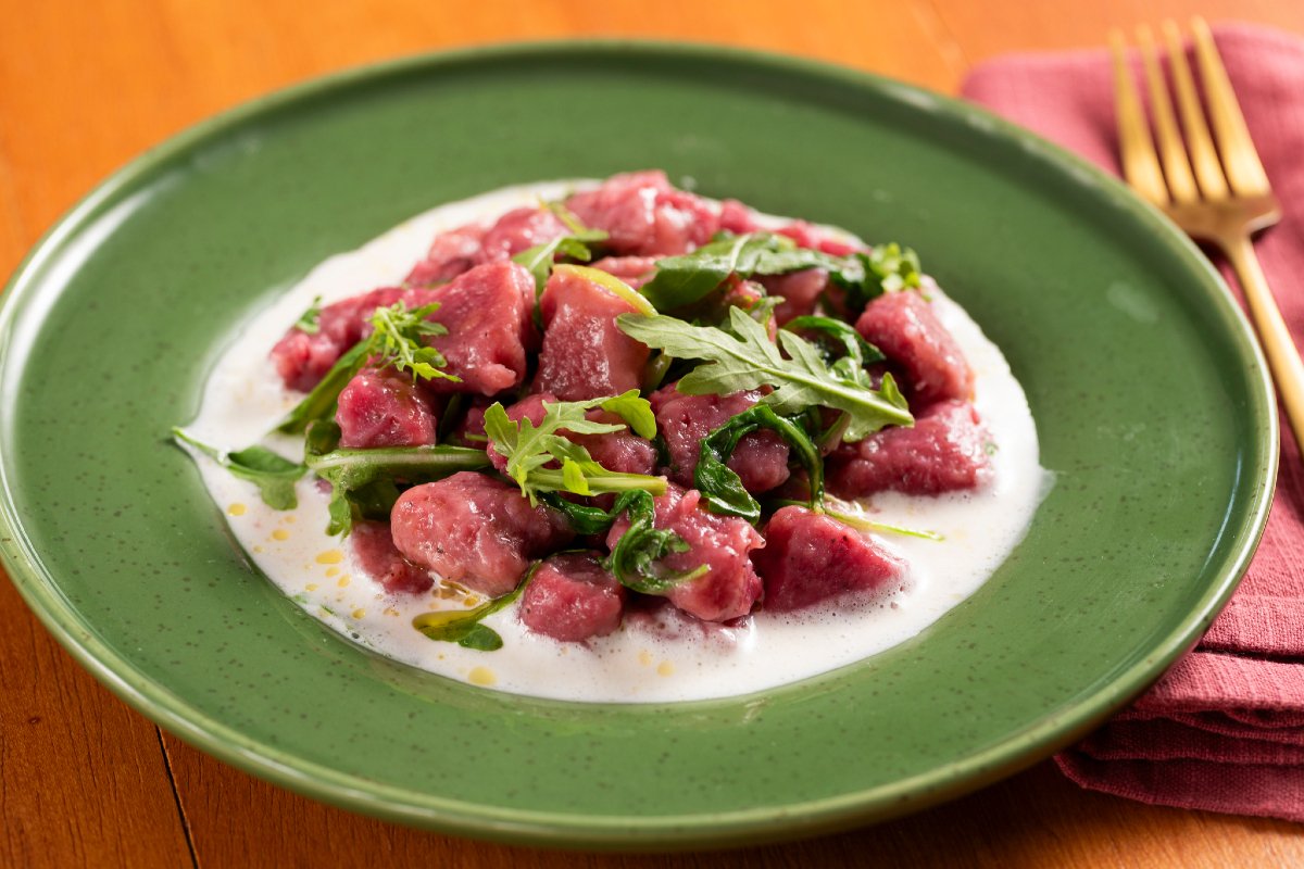 The beetroot dumplings on Taleggio fondue are a first course dish that harmoniously combines flavors, colors, and textures. The fresh beetroot pasta blends the sweet and earthy taste of beetroot, which dyes the Beet Gnocchi a vibrant ruby color, with the delicacy of potatoes, forming a soft and light dough. The arugula, added in the pan with the dumplings, adds a fresh and slightly spicy note, while the creamy and velvety fondue completes the dish with its intense and enveloping flavor. This recipe is perfect for an elegant dinner or a special occasion where you want to impress with a refined and visually appealing dish.