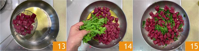 Drain them and transfer them to a pan with a drizzle of oil 13, add the arugula 14, and sauté for a few minutes 15.