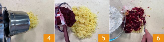 Mash the potatoes on the work surface 4, add the beetroot 5, a pinch of salt, and the flour 6.