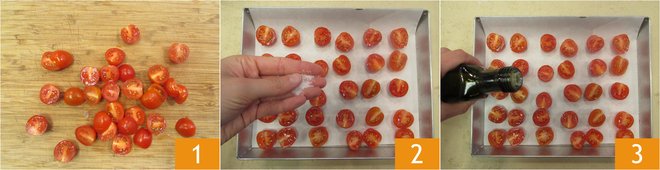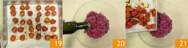 Meanwhile, the confit tomatoes will be ready 19. Dress the gnocchetti with oil 20 and add the confit cherry tomatoes 21.