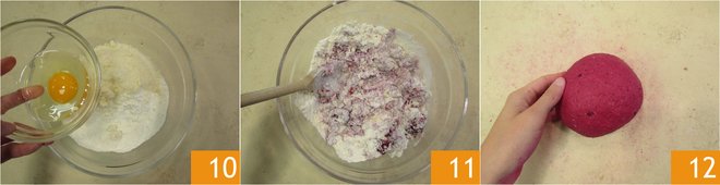 Finally, add the egg 10. Work the dough for 5 minutes, adding the remaining flour 11, and then form a loaf 12.