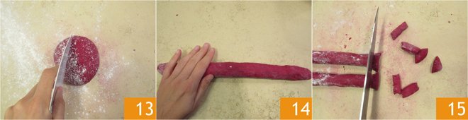 Divide the loaf in two 13, create small rolls 14, and with the help of a sharp knife, cut pieces of about 3/4 inch 15.