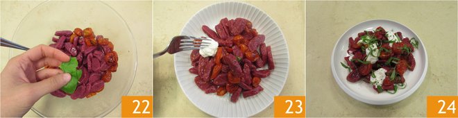 Fragrance with fresh basil 22 and salt. Finally, add the stracciatella and serve the Beetroot gnocchetti with cherry tomatoes and stracciatella hot 24.