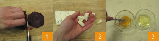 To make the beetroot savory pie, start by preparing the ingredients: take the pre-cooked beetroot and cut it into slices a few millimeters thick 1, then remove the rind from the sweet gorgonzola and cut it into chunks 2. Finally, separate the yolk from the egg white, place them in two different small bowls, and lightly beat both with a fork 3.