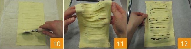 At this point, take the remaining half of the puff pastry and, with a pastry wheel or a small knife, make closely spaced horizontal cuts along the entire length of the sheet, always taking care to leave the edge of the rectangle intact 10. Gently lift the perforated sheet and lay it over the first sheet, covering the filling and aligning the edges 11. Press with your fingers on the edges to seal the two sheets together 12.