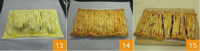 Now take the yolk and brush the entire surface of the savory pie 13, then bake it at 356°F in the preheated static oven for about 15 minutes, until the puff pastry is nicely golden 14. Once it has cooled slightly, your beetroot savory pie is ready to be sliced and served 15!