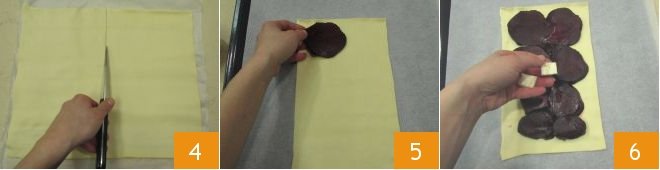 Now take the puff pastry roll, unroll it, and cut it in half lengthwise 4, then transfer one of the halves onto a baking sheet lined with parchment paper and preheat the oven to 356°F in static mode. Cover the surface of the puff pastry with the beetroot slices, being careful to leave the space around the edges free 5, then distribute the gorgonzola pieces evenly 6,
