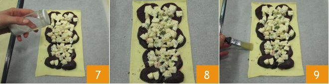 salt 7, pepper, and add the thyme leaves 8. Finally, brush the edges of the puff pastry rectangle with the egg white 9.