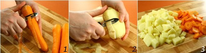 Peel the carrots 1 and potatoes 2; cut the potatoes into pieces and the carrots into slices 3, then boil them in salted water 4.