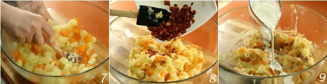 When the vegetables are ready to be mashed, drain them well and place them in a bowl; with the help of a fork, mash them 7 until they become a puree. Add the butter, mix, and then add the crispy bacon 8, grated nutmeg, pepper, and finally add the cream 9; after mixing all the ingredients, serve the carrot stoemp immediately.