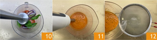 Blend well with an immersion blender for a few minutes 10. Once the mixture is blended 11, strain it 12.