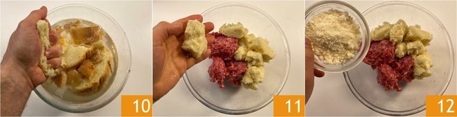 After a few minutes, squeeze out the bread 10 and discard the crust, then transfer it to a bowl with the ground meat 11 and add the grated Parmigiano Reggiano DOP 12.