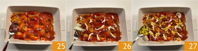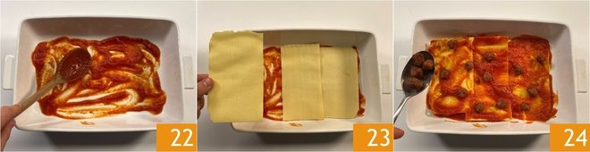 You're ready to assemble the lasagna: take a 20x30 cm (8x12 inch) baking dish and spread some sauce on the bottom 22, then place 3 sheets of pasta, slightly overlapping them 23. Cover with more sauce and distribute some meatballs 24.