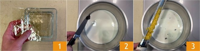 To prepare the berry millefeuille, start with the custard cream, one of the elements of the diplomat cream: place the gelatin in a bowl with cold water 1 and let it soak for about ten minutes. Meanwhile, heat the milk in a saucepan, flavoring it with the seeds of the vanilla pod 2 and the grated lemon zest 3; it should come close to a boil.