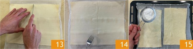 While the cream is cooling, take care of the puff pastry: roll it out on the work surface and divide it into 2 rectangles 13, then prick them with a fork 14. Transfer the pastry sheets onto a baking sheet with their parchment paper and sprinkle the entire surface with powdered sugar 15.