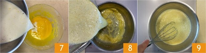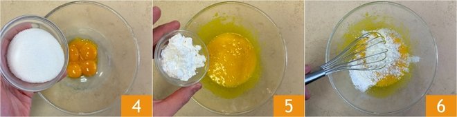 In a separate bowl, pour the egg yolks and sugar 4, whisk them, then add the cornstarch 5 and mix again 6.