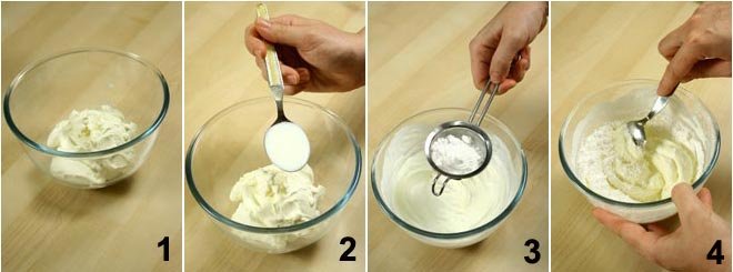 In a bowl, soften the mascarpone by adding 2-3 tablespoons of milk (1-2), then add the powdered sugar 3, vanilla extract, and mix all the ingredients well 4.
