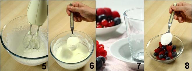 In another bowl, whip the cream 5 and add it to the mascarpone mixture 6. Then place the mixture into the cups and let them set in the refrigerator 7. Mix the berries with 1/4 cup of sugar, the juice, and the grated zest of 1 lemon: mix gently and let them macerate 8. Remove the cups from the refrigerator and garnish them with the berries, swirling them with the juice from the berries.