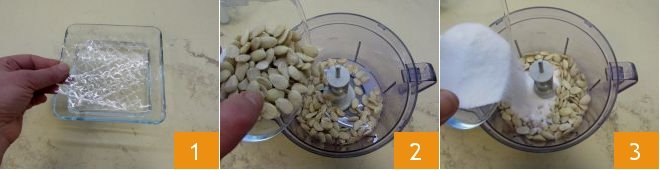 To prepare the blancmange, soak the gelatin sheets in a bowl with cold water for at least 10 minutes 1. Place the peeled almonds 2 together with the sugar in a food processor equipped with blades 3