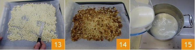 spreading them evenly with the help of a spatula 13: you can use them for the final decoration. Bake in a preheated static oven at 350°F for 30 minutes (or at 320°F for 20 minutes if using a fan oven), until they become golden and crispy 14; remove from the oven, let them cool completely, and set aside. Pour the liquid you previously obtained into a pot, heating it over low heat for 3-4 minutes (it should not come to a boil) 15.