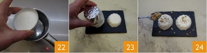 Subsequently, unmold the dessert by dipping the molds in hot water for a few seconds 22. Serve on a serving plate 23 and finally decorate the blancmange by distributing the crunchy almonds you have prepared as desired 24.