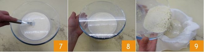 to obtain a smooth and lump-free mixture 7; cover with plastic wrap and let it infuse for an entire night 8. After the necessary time has passed, strain the mixture through a cloth placed inside a bowl 9,