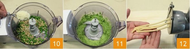and grated Parmesan cheese 10. Blend the peas until you obtain a creamy mixture 11 and set it aside. Take the fresh pasta and make the bigoli with the appropriate machine. Divide the dough into small portions to place in the basket that holds the dough, operate the machine to create the bigoli 12