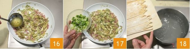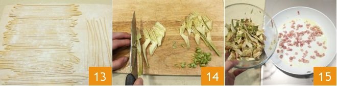 and lay them without overlapping on a well-floured work surface 13. Meanwhile, clean the artichokes by removing the tougher outer leaves, cut the heart into thin strips 14, and to prevent them from browning, keep them in a bowl with water and the juice of half a lemon. Heat a drizzle of oil in a pan, sauté the bacon cubes for a few moments, and then add the artichokes 15,