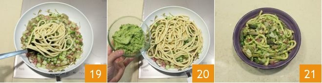 then drain them directly into the pan with the sauce 19, at this point, incorporate the pea pesto 20, mix, and lastly add the asparagus tips. The bigoli with asparagus, artichokes, and pea pesto are ready to be enjoyed 21!
