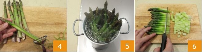 Carefully wash the asparagus under running water, removing the fibrous green part with a peeler 4. Cook them for about 10 minutes in boiling water in an asparagus steamer, making sure to leave the tips, the most delicate part, outside (cooking times may vary depending on the thickness of the stalks) 5. Once cooked, cut the stems into pieces 6 and set the tips aside.