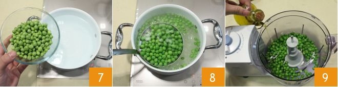 Meanwhile, cook the peas in boiling water 7; when they are tender, drain them 8, transfer them to a mixer, add olive oil 9, and pine nuts