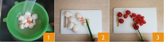 To prepare the bigoli with scallop ragù, start with the scallops. After cleaning them, rinse them 1 and drain them well before cutting them into 4 parts 2. Set them aside for a moment and then cut the cherry tomatoes, also into 4 parts 3.