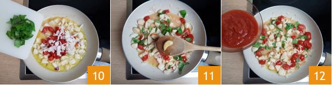 and the basil leaves 10. Quickly sauté everything, then remove the garlic 11 before adding the tomato puree 12,