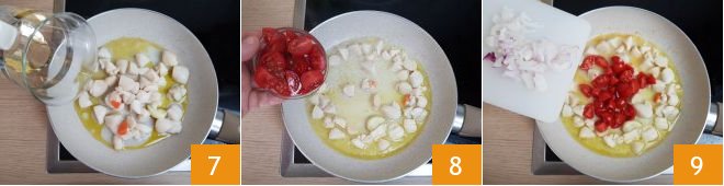 Deglaze with white wine 7, let the alcohol evaporate, and add the chopped cherry tomatoes 8, the sliced shallot 9,