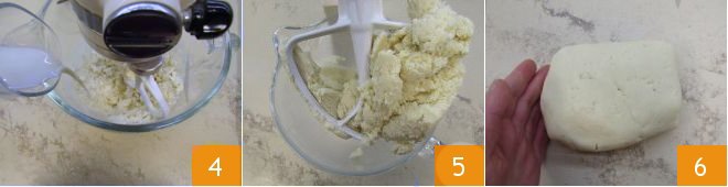 Run the mixer at medium speed, add the cold milk slowly 4, and let it mix until a rather compact dough forms 5 (if you don't have a stand mixer, you can easily make this dough by hand). Transfer the dough onto a work surface (preferably cold) and work it just enough to form a flattened block 6.