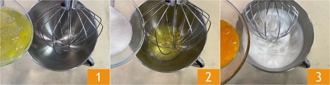 To prepare the Black Forest zuccotto, start with the cocoa cookie dough: in a stand mixer with a whisk attachment, whip the egg whites 1 with the sugar 2 until you obtain a creamy and glossy consistency. Beat the yolks with a fork and incorporate them into the mixture with a spatula 3.