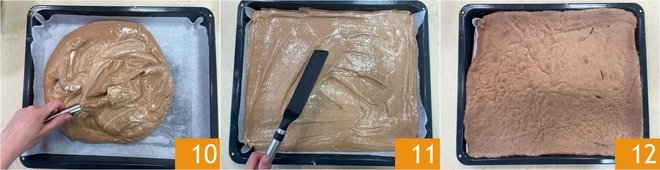 Pour the batter into a baking tray about 18x15 inches, greased with oil and with the base lined with baking paper 10, level it well with the spatula 11 and bake in a preheated static oven at 375°F for about 15-20 minutes on the middle rack. Remove from the oven 12.