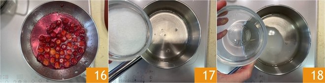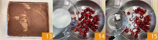 Immediately invert the hot cake 13, then cover the entire surface with cling film and let it cool. Pit the cherries and cook them in a pan with the sugar 14 and the liqueur 15.