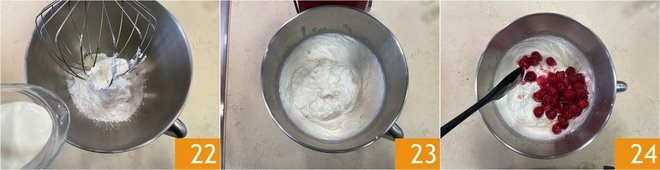 Add the fresh cream 22 and whip the cream until it's fluffy and homogeneous 23. Take 500 g of the mixture and add the cooked cherries 24; store the rest of the mixture in the fridge, as it will be used for decorating.