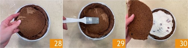 Line a zuccotto mold about 4 inches high and with a 8-inch base diameter with cling film. Place the largest cookie dough disc inside 25 and moisten it with the syrup 26. Pour half of the filling inside the mold 27.